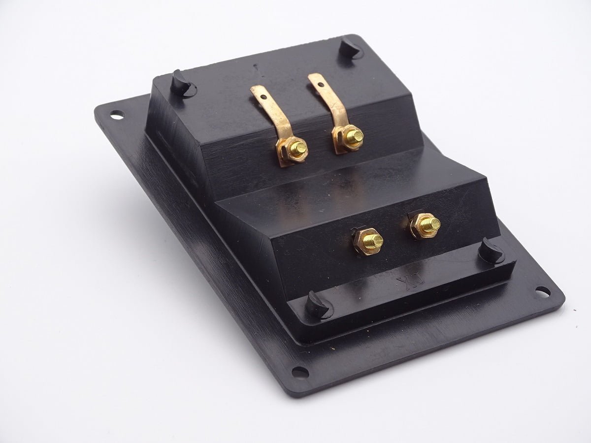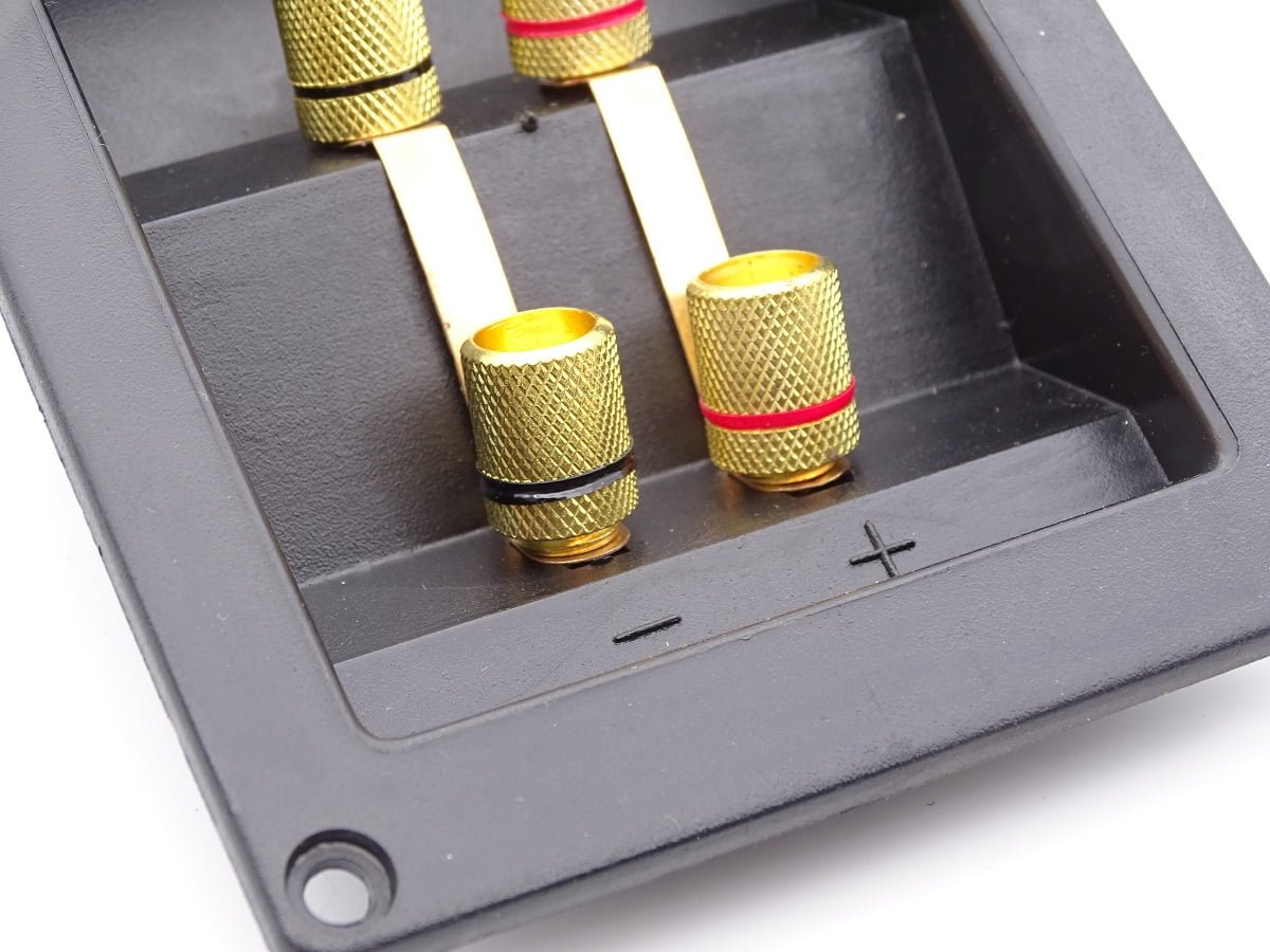 Bornier haut parleur rectangulaire à encastrer avec bornes dorées.