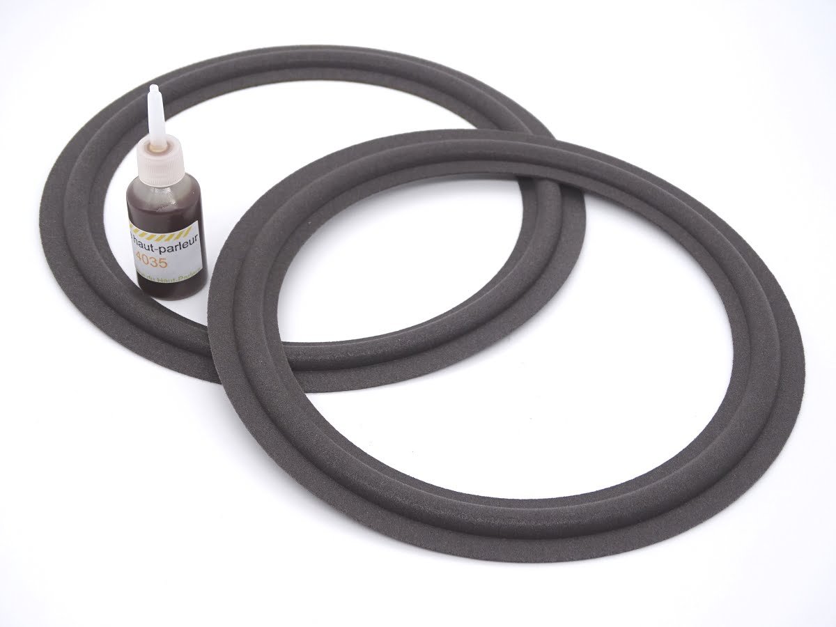 Kit de réparation haut-parleur comprenant 2 suspensions mousse longue durée et 1 colle spéciale haut-parleur.